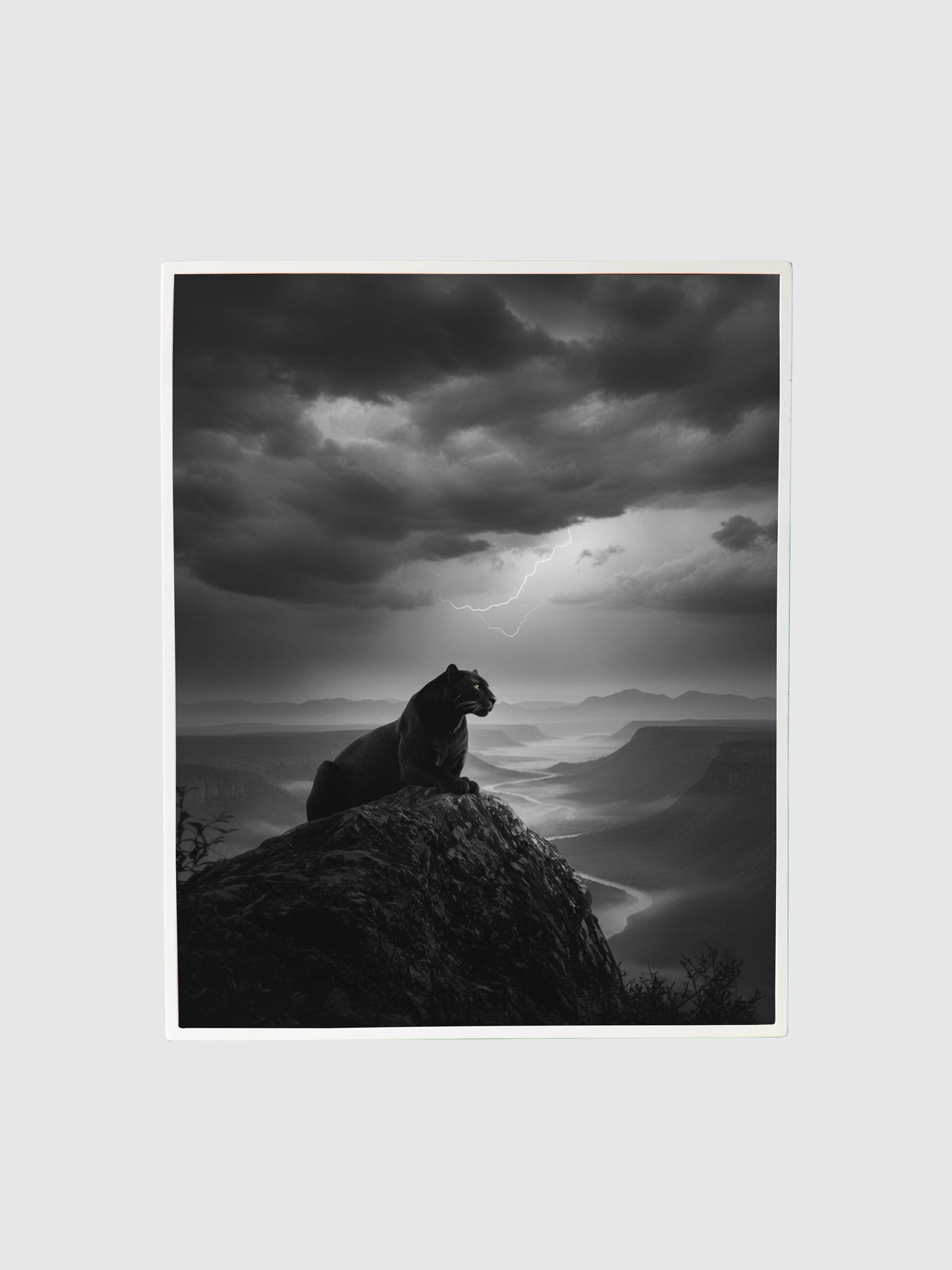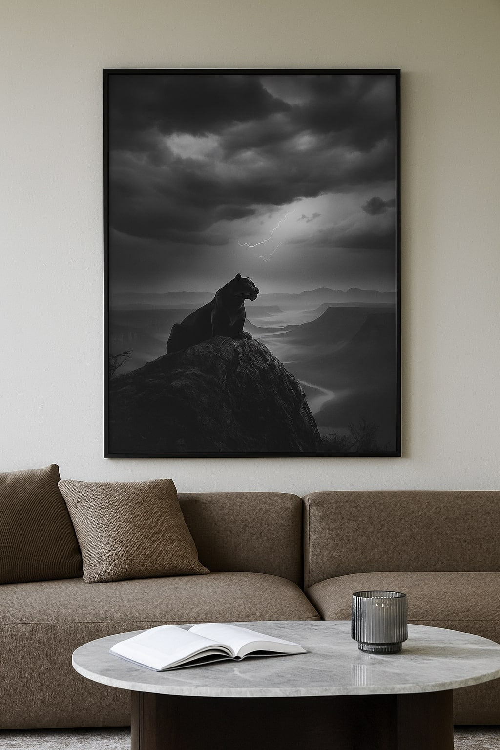 The Fearless Spirit is a powerful tribute to courage and strength, capturing a majestic panther poised on a rocky cliff beneath a storm-lit sky. The dramatic monochrome tones and striking composition evoke an atmosphere of intensity and resilience, reflecting the spirit of the untamed wilderness.