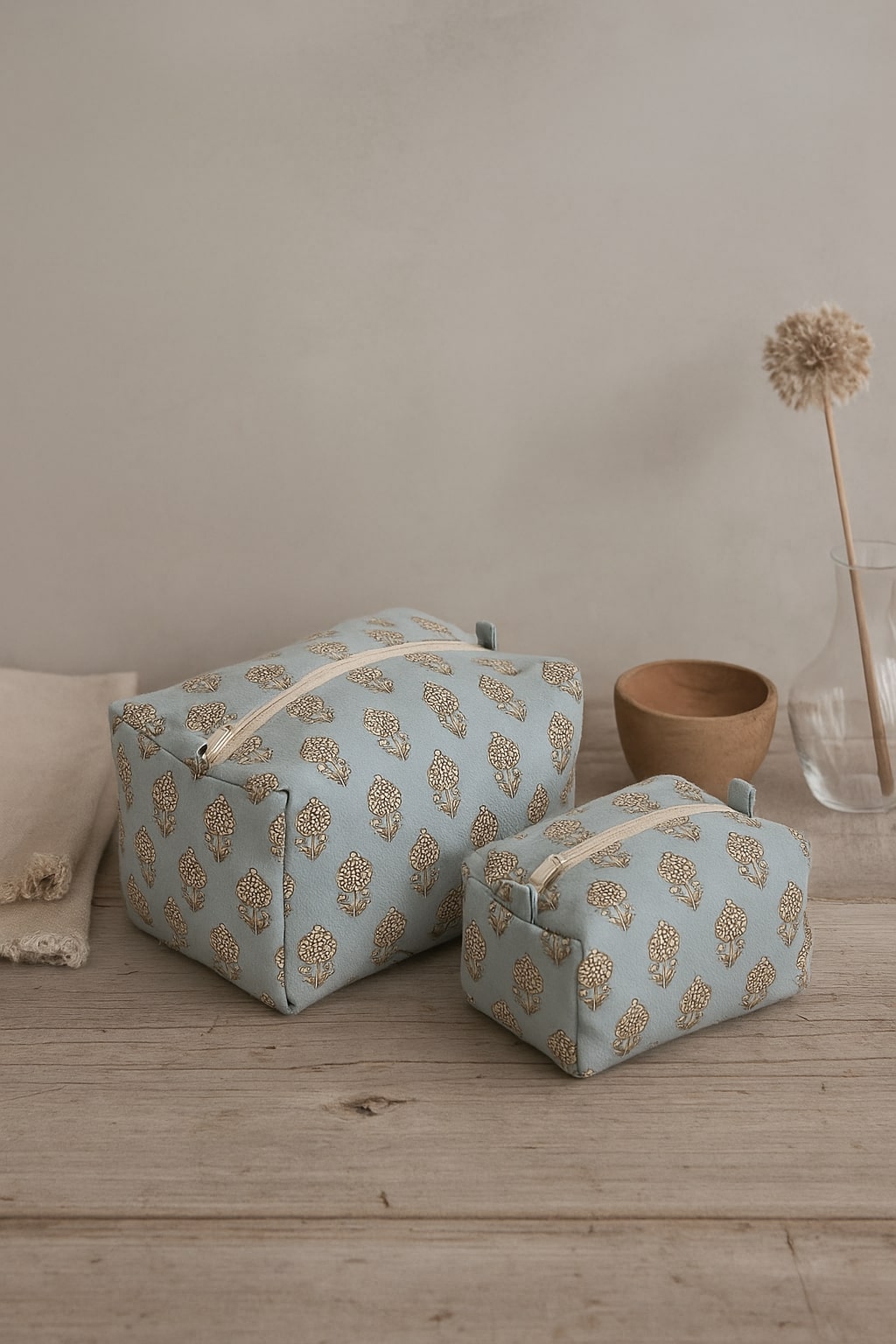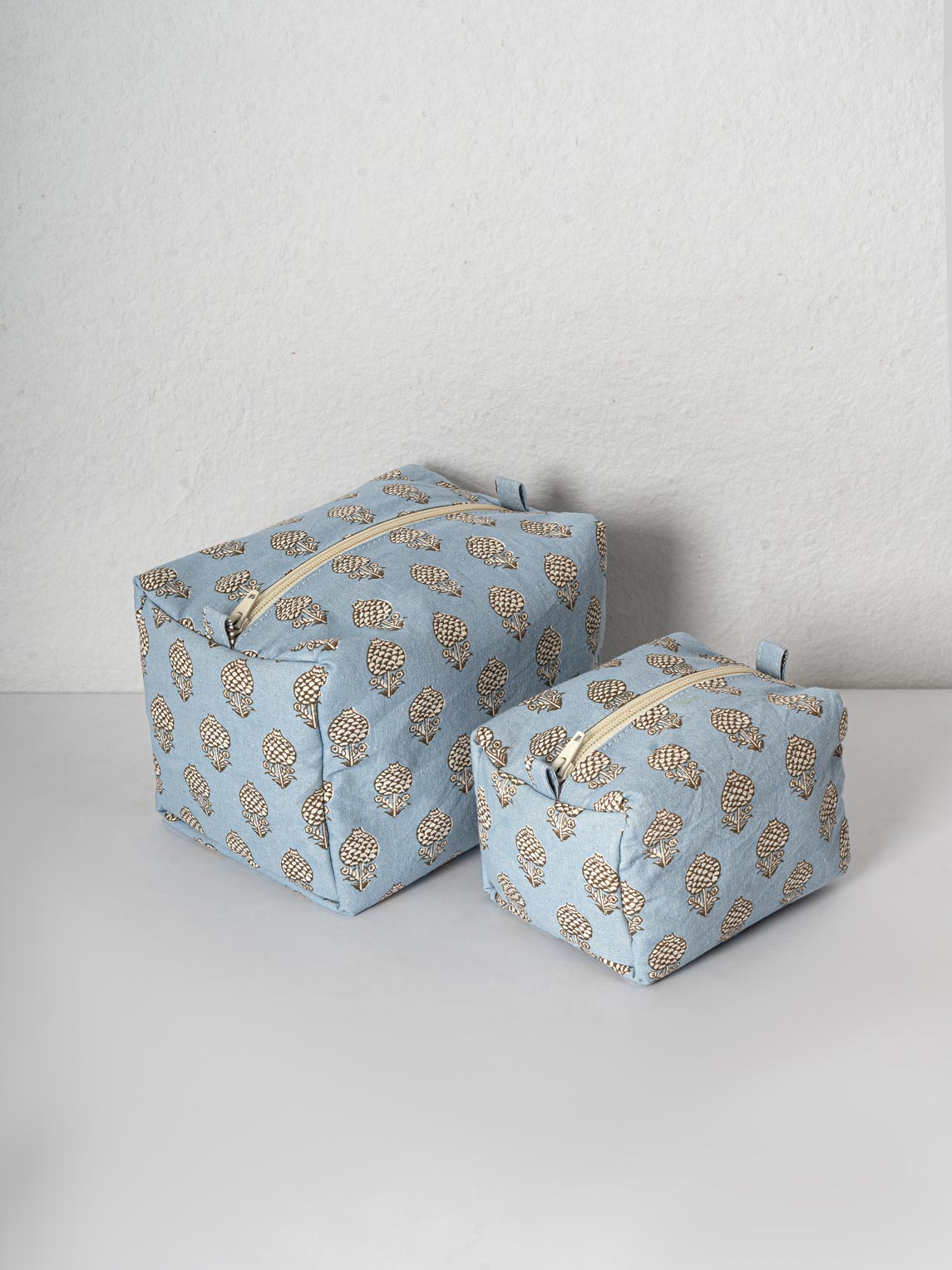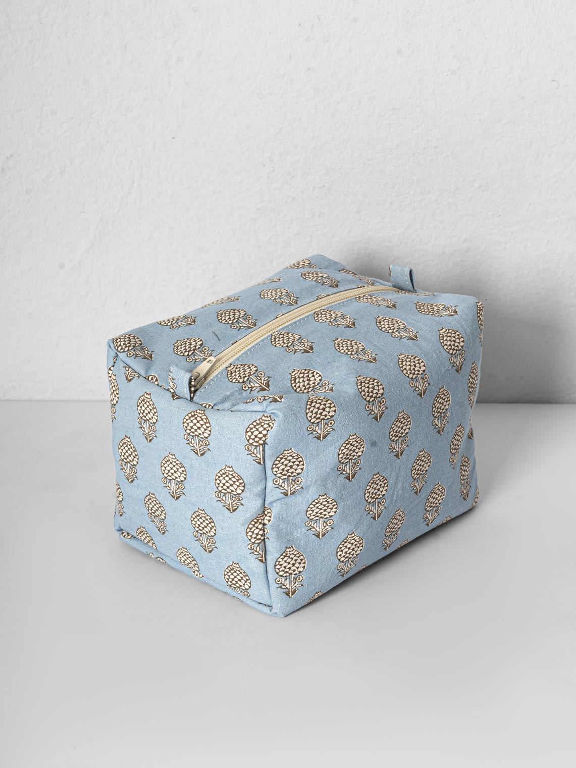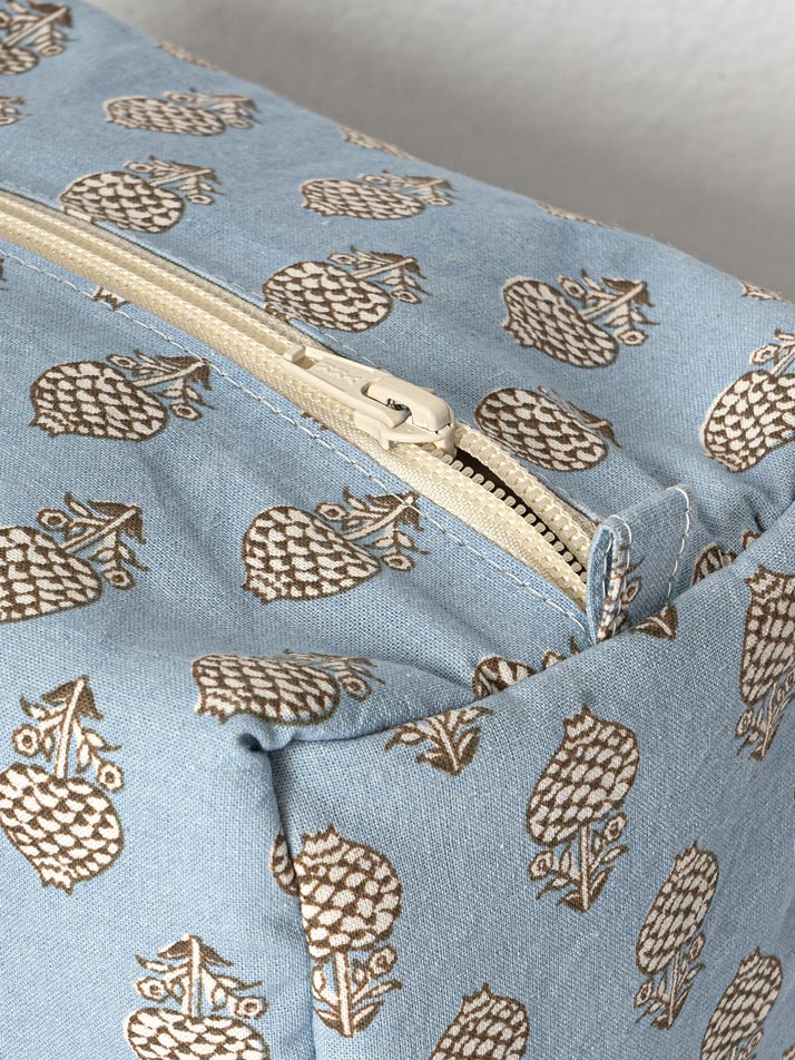 Crafted from smooth cotton, this pouch showcases a charming pinecone-inspired block print in brown against a light blue background. Its boxy shape provides ample storage space, and the sleek zipper ensures secure closure. Perfect for organizing small items with a touch of artisanal flair.