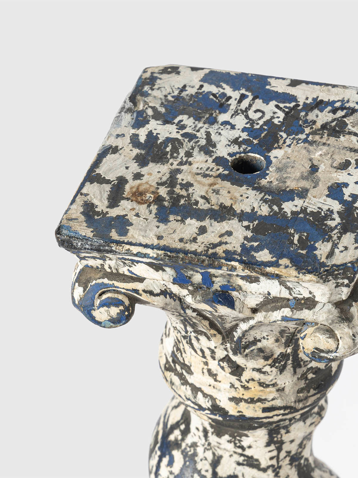 Striking Ericeira wooden candle holder features an intricately twisted design with a distressed blue and white finish. The ornate top and sturdy square base exude vintage charm. Ideal for adding character and elegance to any setting, it’s a beautiful blend of rustic and classical aesthetics for timeless appeal.