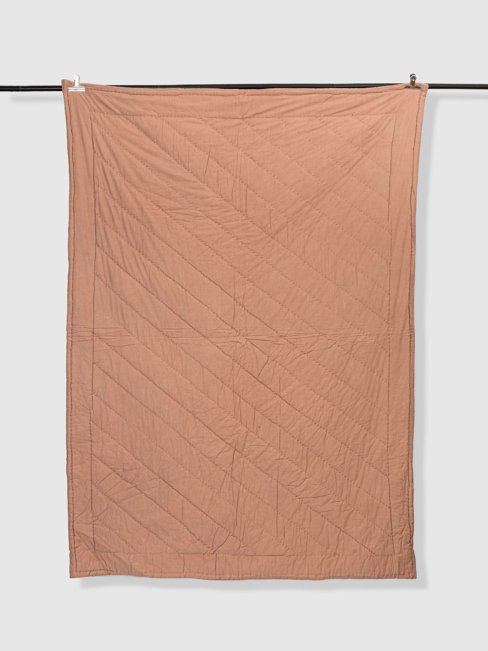 This artisanal quilt showcases a rustic geometric block print in earthy tones of terracotta and cream. Hand-stitched with care, it exudes a natural, organic elegance. Ideal as a cotton throw blanket or wall hanging, it adds minimalist texture to any boho-inspired or neutral home decor.