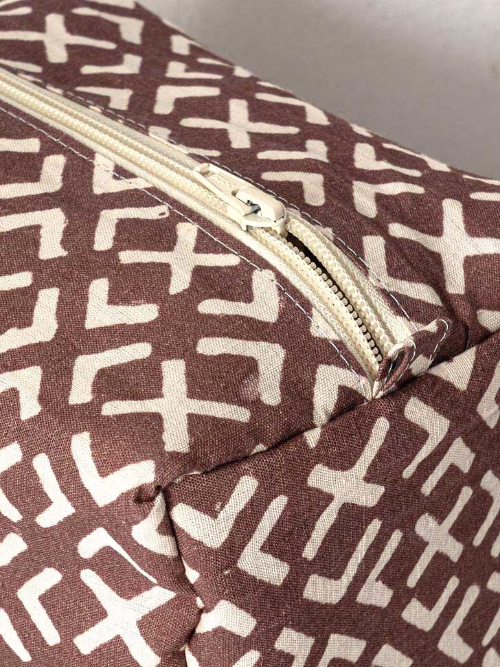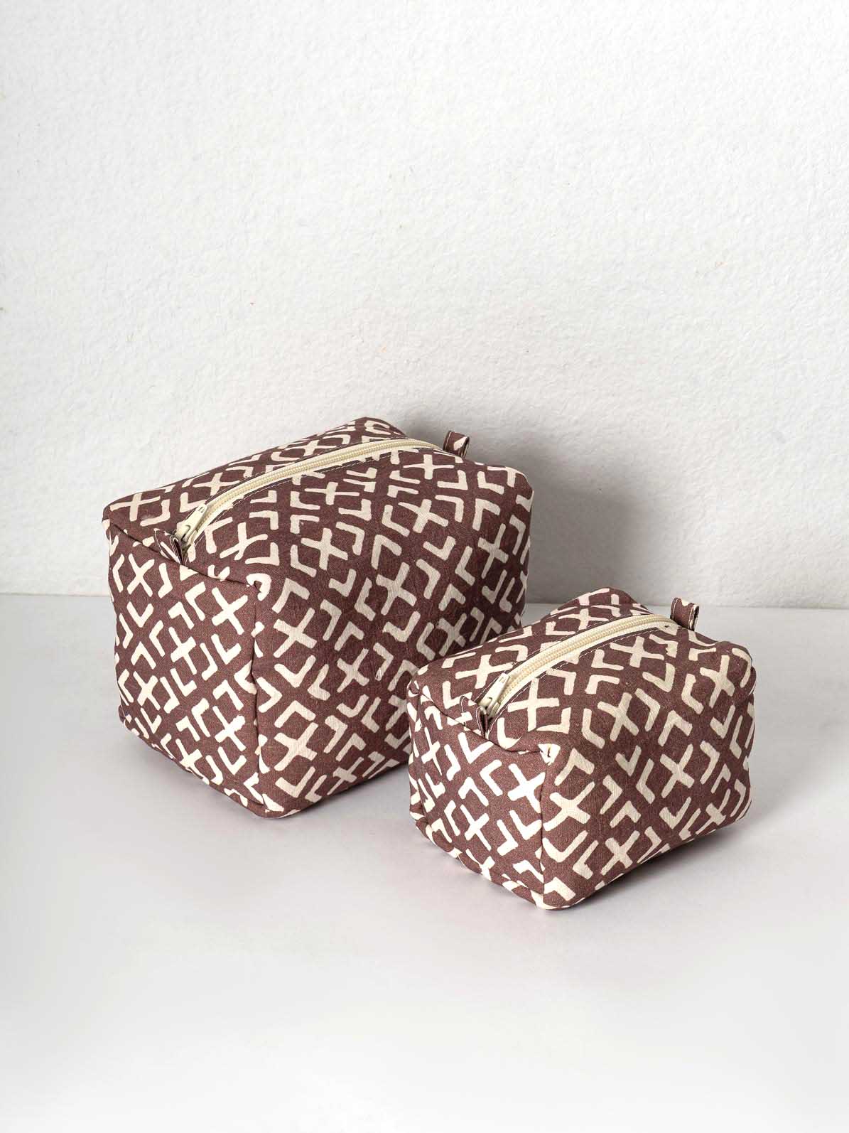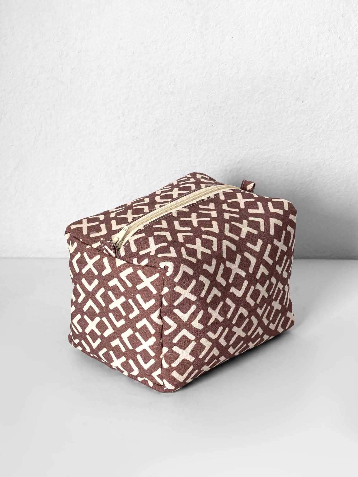 This pouch showcases a bold pattern of interlocking white and dark brown shapes on a chocolate brown fabric. Its zippered closure ensures secure storage, while the side loops add convenience. Perfect for organizing cosmetics, skincare products, or small accessories, it’s both functional and stylish.