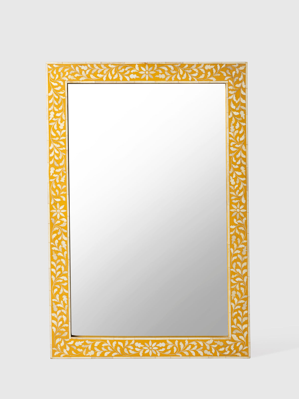 A statement of craftsmanship and elegance, this scalloped mirror is hand-finished with intricate bone inlay detailing. The petal-inspired silhouette softens the design, adding a graceful charm that feels both modern and timeless. Perfect for hallways, bedrooms, or above a console, it brightens spaces while doubling as a captivating wall accent. Each piece is unique, showcasing the artistry and heritage of inlay work.