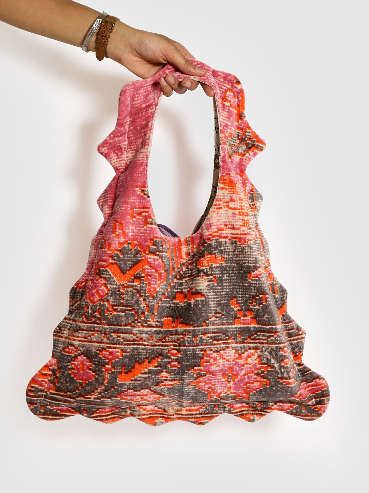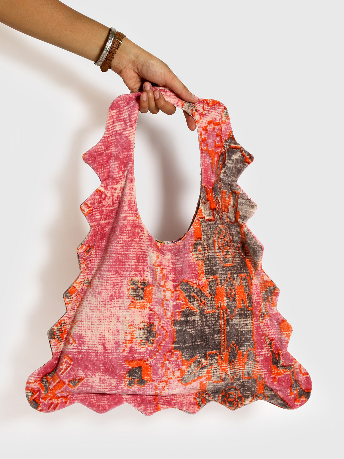 Elevate your everyday style with this striking floral tote crafted in luxurious velvet. The rich dark teal base is beautifully adorned with bold blossoms in shades of red, ivory, and indigo—bringing a touch of vintage charm and effortless elegance to your wardrobe. Its sculptural wavy silhouette and soft, comfortable grip make it both eye-catching and practical for daily use.