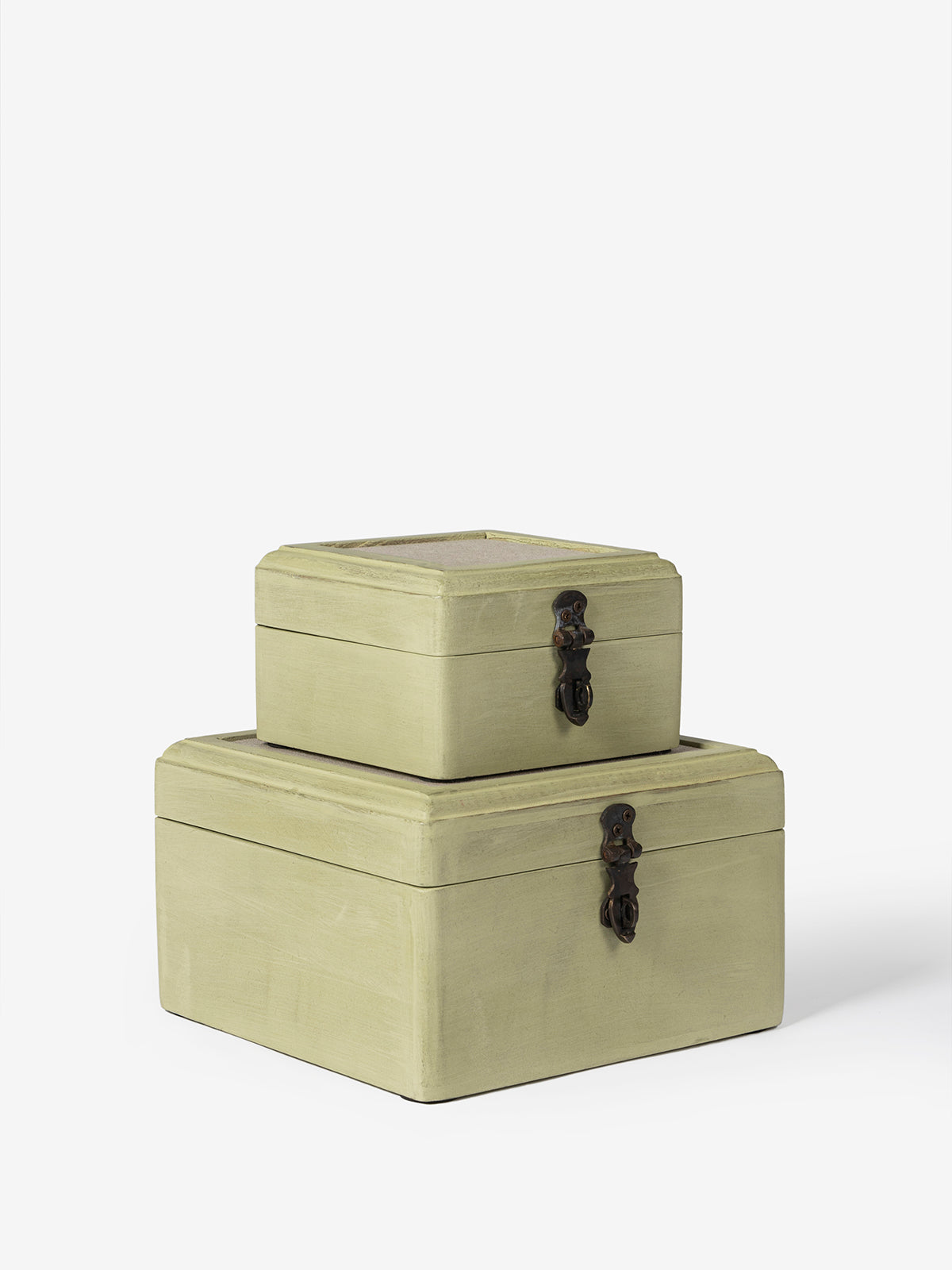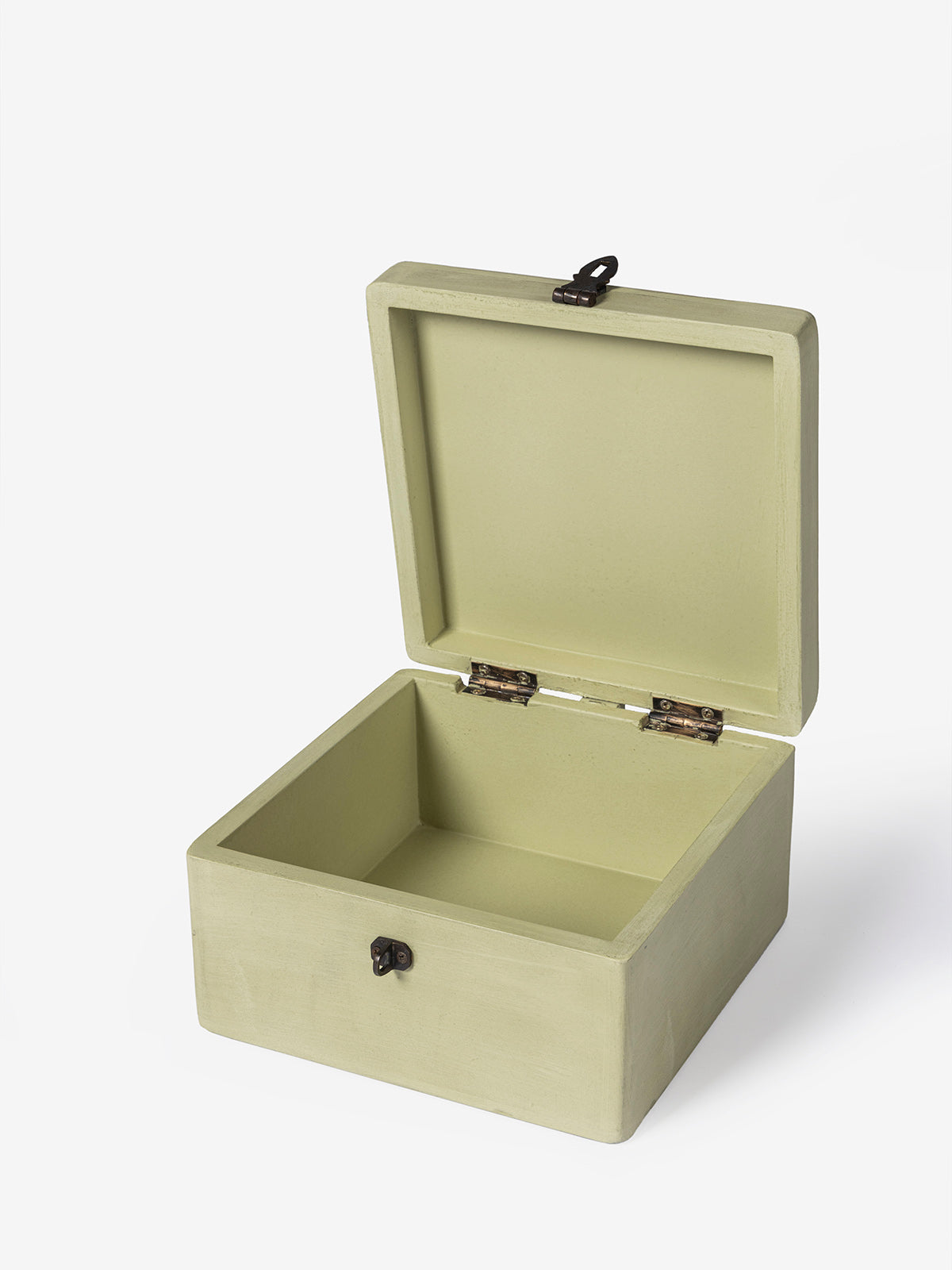 This wooden box has an aesthetic look, featuring a muted lavender color with a weathered finish. The box's latch is made of metal, giving it a royal look. The textured surface on the lid adds a touch of elegance, while the overall look is both understated and refined.