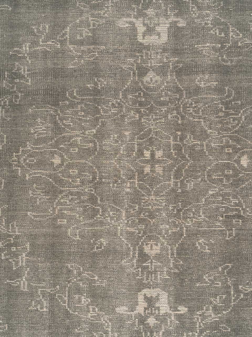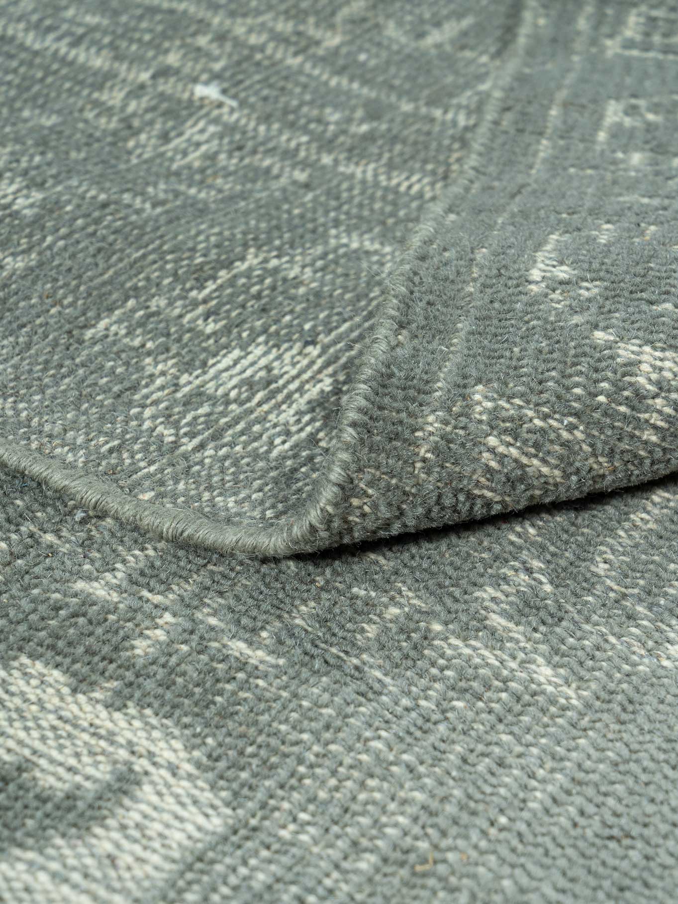 This rug is expertly hand-knotted from wool and showcases a refined medallion and scrolling vine pattern in a calming, minimalist palette. Its vintage, faded appearance infuses a sense of antiquity and sophistication, effortlessly complementing both modern and traditional interiors. Ideal for those who value the charm of classic designs with a contemporary flair.