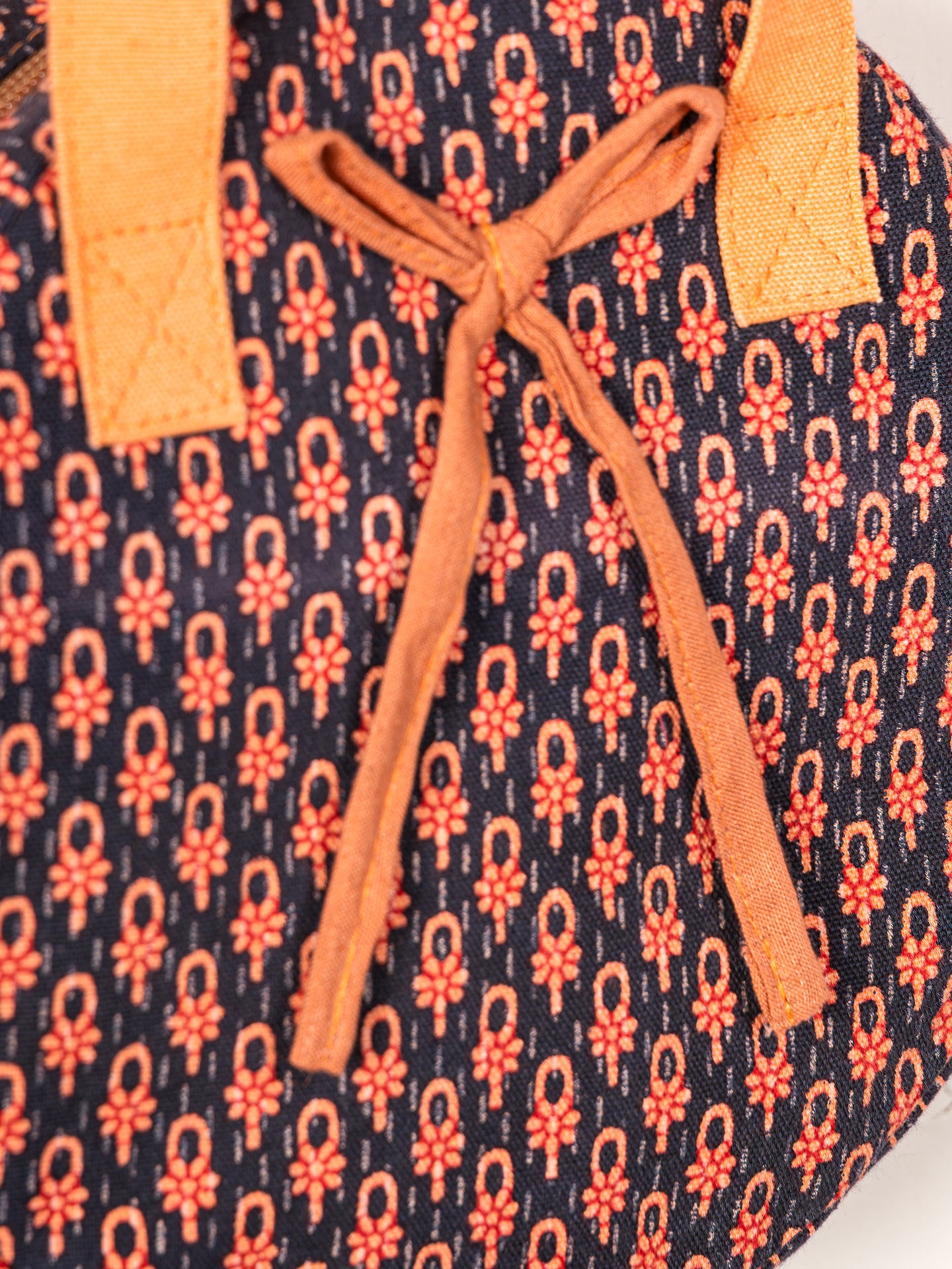 A unique round-shaped tote with a striking black base and orange floral motifs. Designed with bright orange handles and a tie-up closure, this bag adds a playful yet stylish twist to your accessory collection. Perfect for those who love bold and quirky fashion statements.