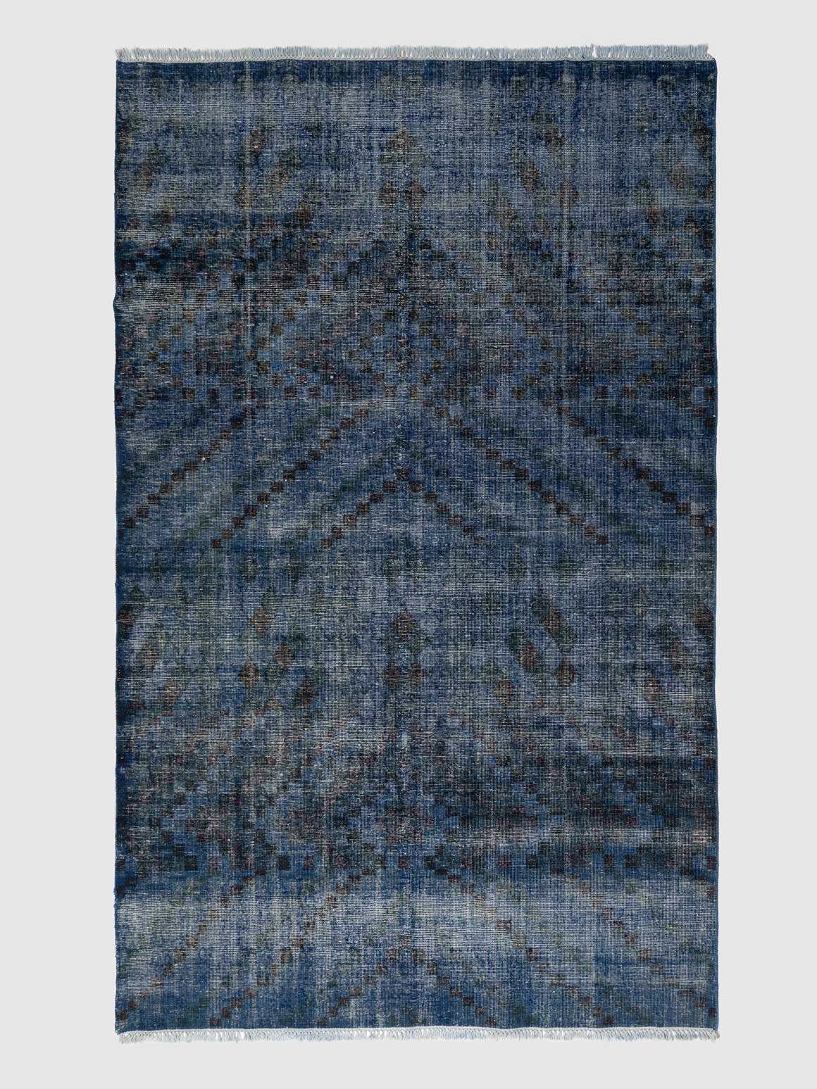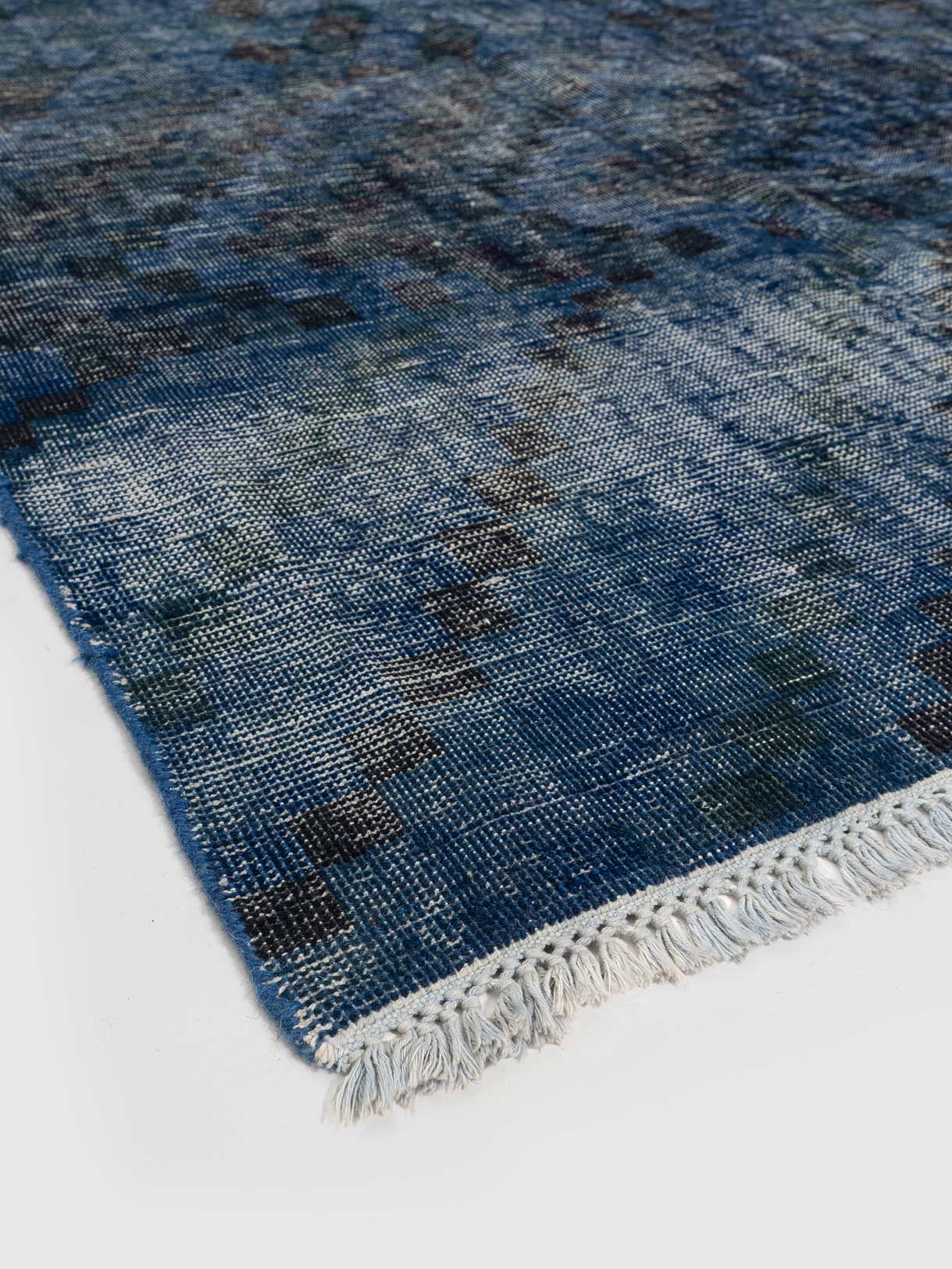 The Samburu Rug captivates with its deep blue and charcoal hues, intricately melded in a distressed tribal pattern. This hand-knotted wool rug offers a dramatic, artistic touch to the room, perfect for creating a statement floor space with its rich colors and engaging design. Ideal for those looking to add depth and intrigue to their decor.