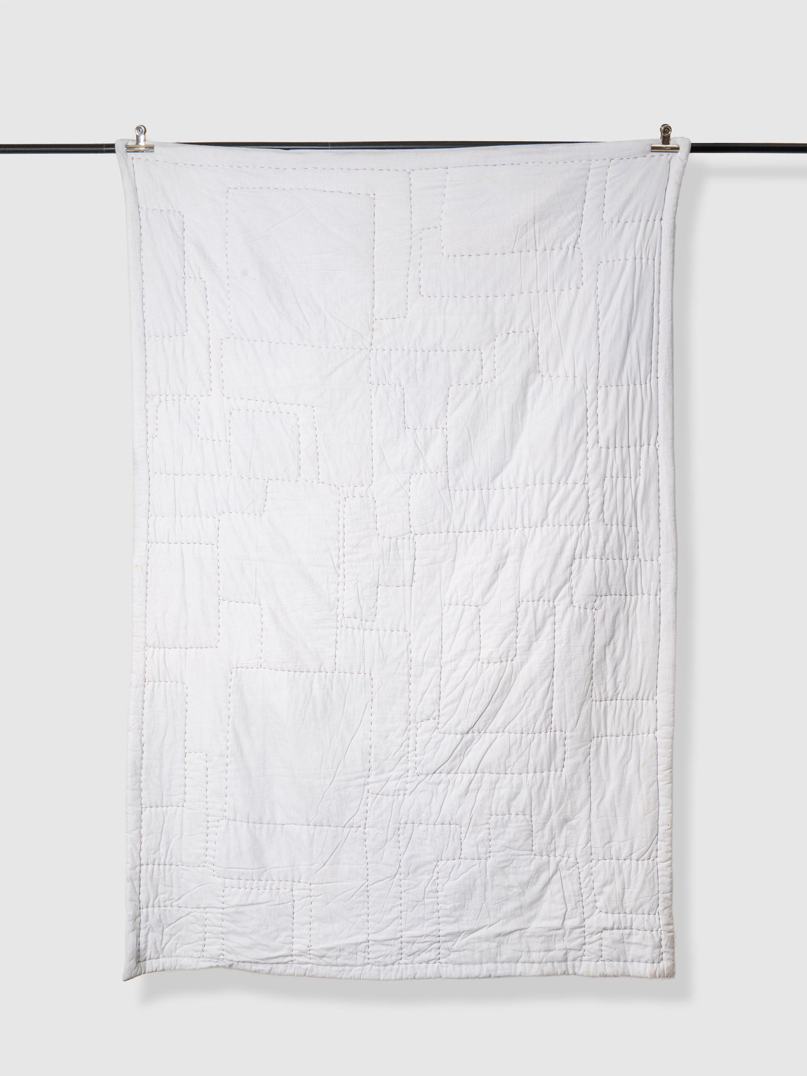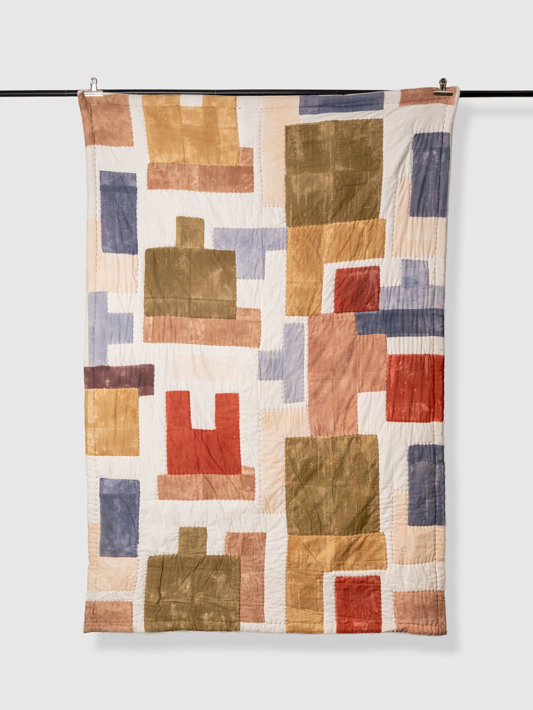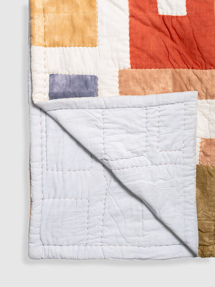 A soft-toned abstract patchwork quilt with pops of olive, rust, cream, and periwinkle. Its irregular geometric shapes create a contemporary and cozy visual appeal. Handmade from natural cotton, it’s ideal as a bedspread or artistic wall hanging for stylish, laid-back interiors.
