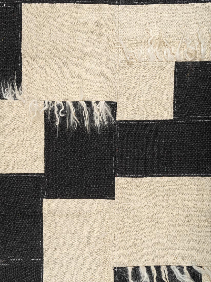 Add modern charm to any space with this black and beige wool patch rug featuring a bold patchwork design and fringe detailing. Made from natural cotton, this handwoven area rug blends style with comfort, making it a perfect choice for contemporary home décor and eco-conscious interiors.