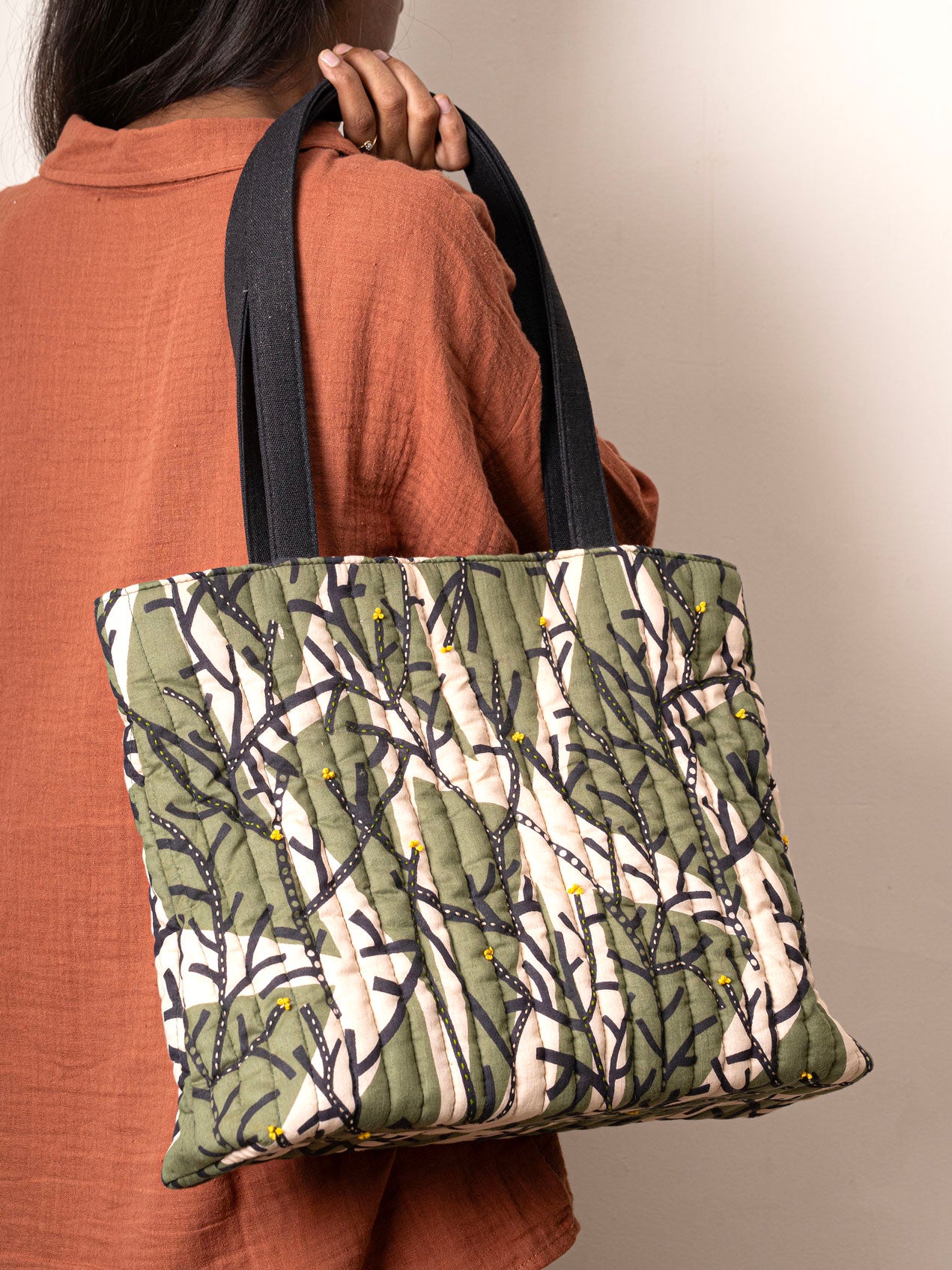 The Wilderness Whispers Tote features an original nature-inspired block print layered with hand embroidery—each stitch a gentle nod to artisan craft.